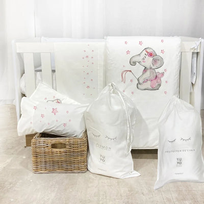 Con este Set Elefanta Bailararina la cuna de tu bebé será un lugar de total descanso. Con un cuidado diseño y telas de la mejor calidad, 100% algodón hipoalergénicas. CUNA: Juego de sábanas, cubre plumón, protector de cuna y plumón para cuna de colchón 70×140 cm. Su delicado estampado harán que su dormitorio sea un lugar placentero y precioso. Para un mayor cuidado de este producto al momento del lavado, utiliza agua tibia y un detergente neutro, evita el cloro y plancha a un máximo de 40°. Todos los productos de Tuyo Print son diseñados y hechos en Chile, con un proceso de producción uno a uno. Estampado con tintas libres de químicos con certificación OEKO-TEX.