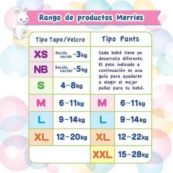 Pañales premium tipo velcro de Merries, se mantienen seco por más tiempo, cuenta con mejor ajuste en el área de la entrepierna y cuenta con indicador de humedad con cambio de color.